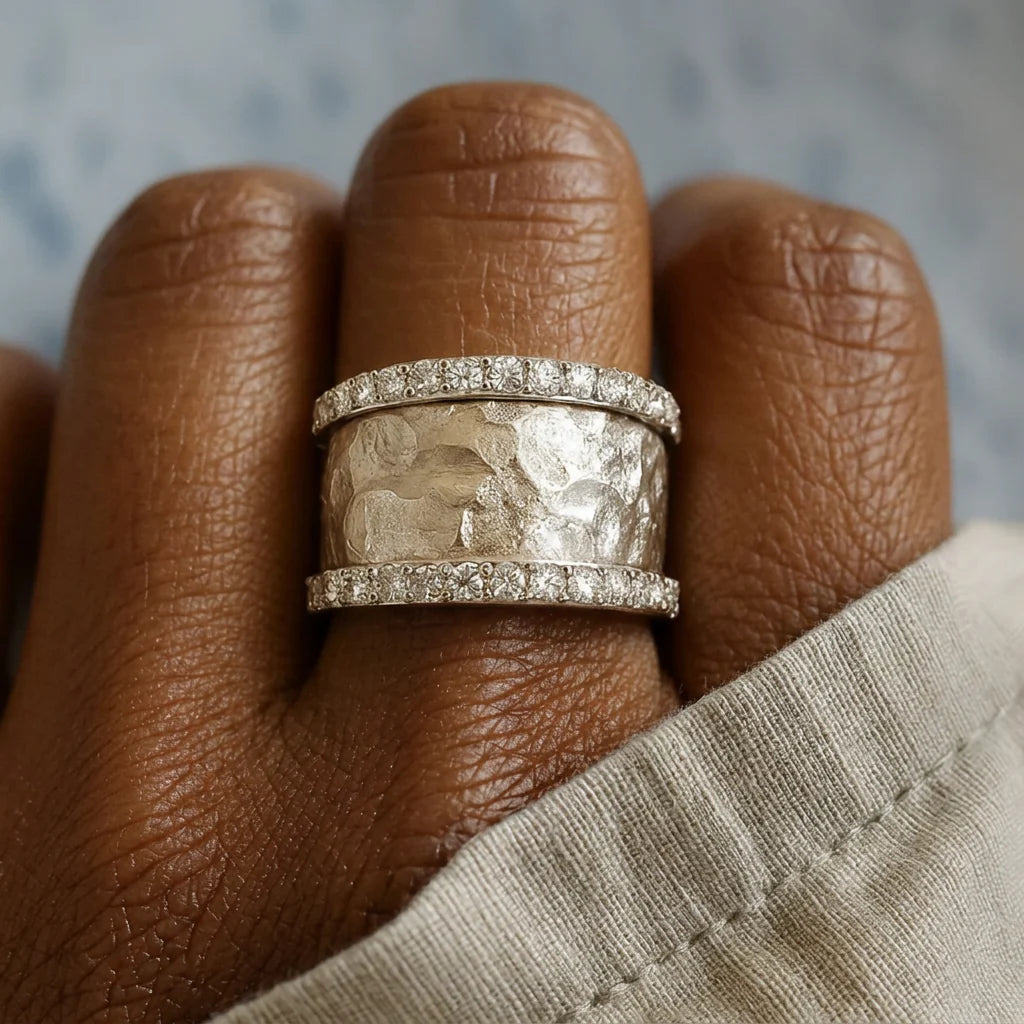 Silver ring encircled by two diamond bands